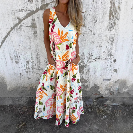 Robe longue femme – Sans manches – Imprimé feuilles – Col en V – Coupe fluide respirante