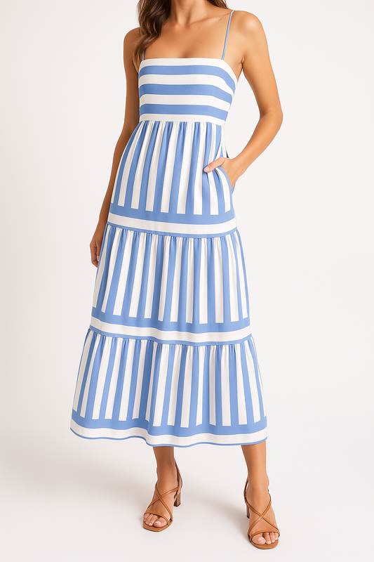 Women's midi dress – Cotton – Flared cut – Stripes – Thin straps – Ruffles
