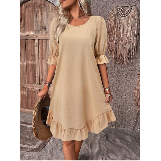 Women's flared dress – Linen and cotton – Loose fit – Mid-length ruffled sleeves