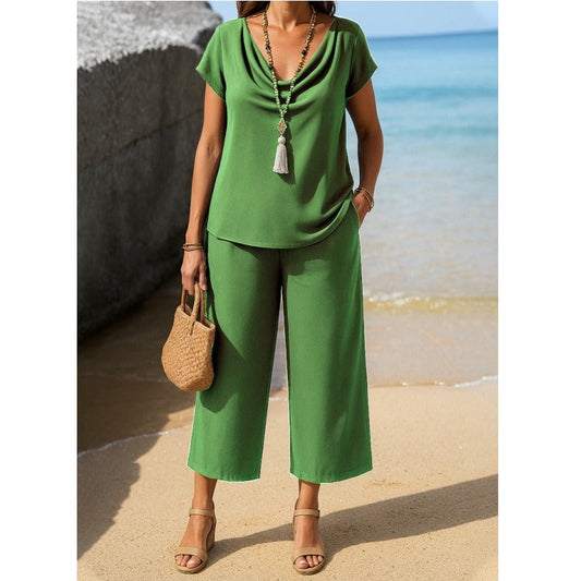 Women's Two-Piece Set – Top with Scoop Neck Short Sleeves – Wide Capri Pants