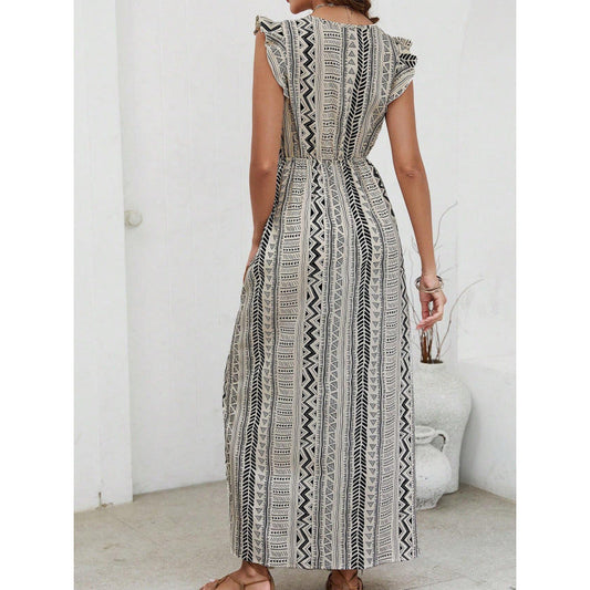 Women's long dress – V-neck – Ruffled sleeves – Fitted waist – Geometric print