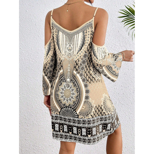 Women's dress – Flowing cut – Bare shoulders – Bohemian patterns – Flared sleeves – Cotton