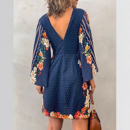 Women's dress – Loose fit – Bohemian floral print – Flared sleeves – Lightweight cotton