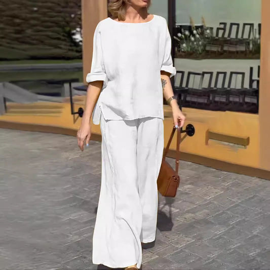 Women's Pants Set – Linen Cotton – Loose Fit – Top Round Neck Short Sleeves