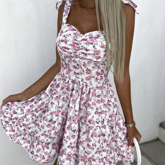 Women's short dress – Flared cut – Floral print – Thin straps – Ruffled skirt