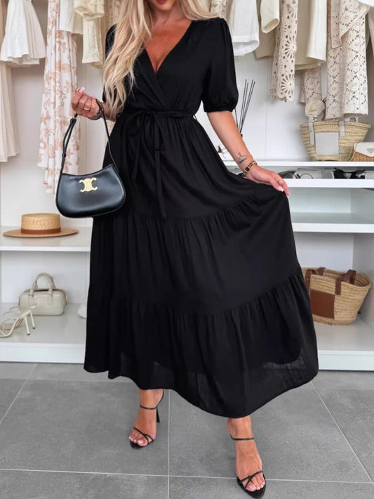 Long women's dress – Lightweight linen – Flared cut – Wrap neckline – Puff sleeves