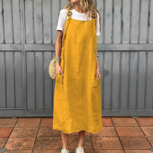 Women's dress – Light linen – Relaxed fit – Adjustable straps – Midi length – Front pockets