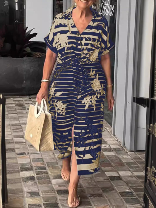 Shirt Dress Woman – Botanical Print – Fluid Cut – Short Sleeves – Side Slit