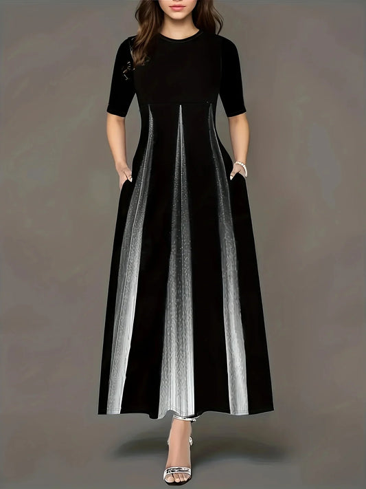 Women's long dress – Flowing cut – Pleated skirt – Short sleeves – Side pockets