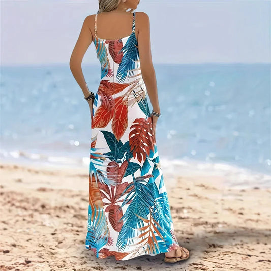 Women's long dress – Flowing cut – Thin straps – Tropical print – Sleeveless
