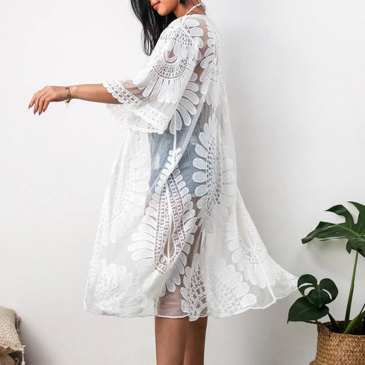 Women's Kimono – Lightweight Sheer Fabric – Relaxed Fit – Lace – Tied Belt