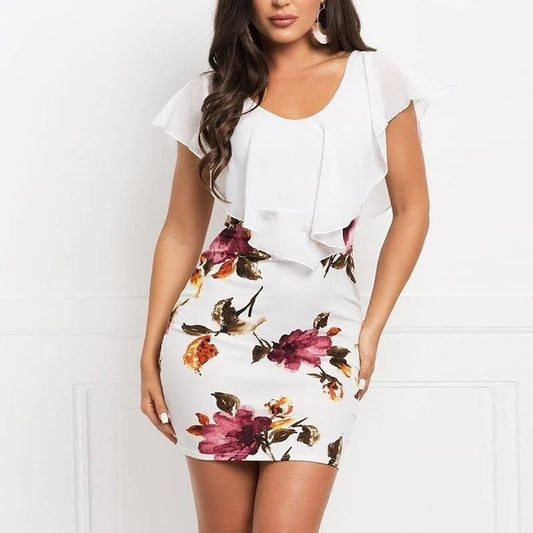 Women's sheath dress – Slim fit – Floral pattern – Round neck – Sheer ruffles – Mini