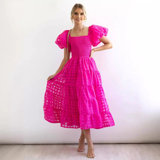 Women's long dress – Off-the-shoulder – Puff sleeves – Smocked waist – Ruffled skirt