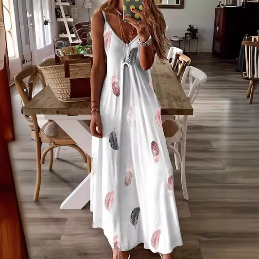 Women's long dress – Sleeveless – Leaf print – V-neck – Breathable flowing fit