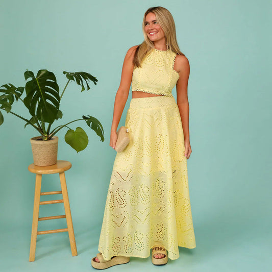 Women's Two-Piece Set – Breathable Fabric – Sleeveless Crop Top – Flared Long Skirt – Embroidery Detail