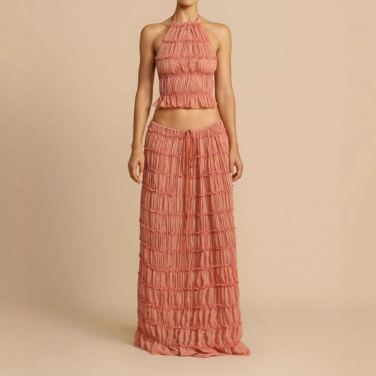 Women's Two Piece Set – Ruched Halter Top – Long Skirt With Elastic Waist – Breathable Fabric