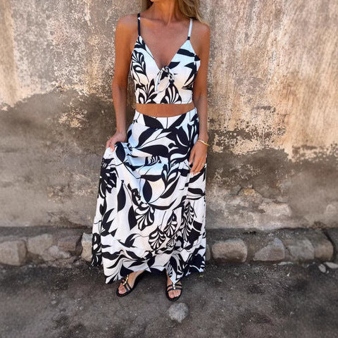 Women's Two-Piece Set – Knotted Crop Top – Long Flowy Skirt – Breathable Fabric