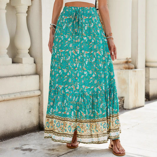 Women's long skirt – Flowing cut – Bohemian ruffled style – Floral print – Natural fibers