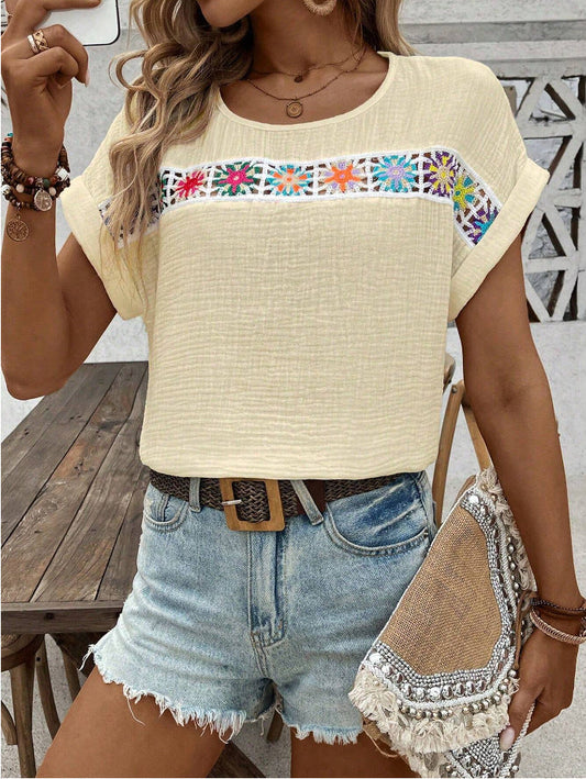 Women's V-Neck Blouse – Relaxed Fit – Embroidered Motifs – Breathable Fabric – Short Sleeves