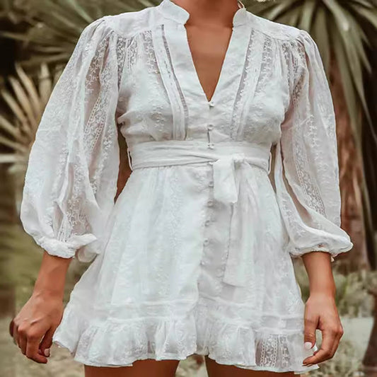 Women's short dress – Long balloon sleeves – Tied waist – Breathable flowing fabric