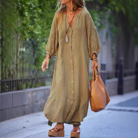 Women's long dress – Loose fit – Breathable fabric – V-neck – Long sleeves