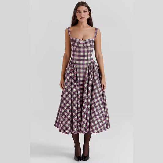 Women's Long Dress – Elegant Checked Pattern – Sweetheart Neckline – Flowing Fabric with Pockets