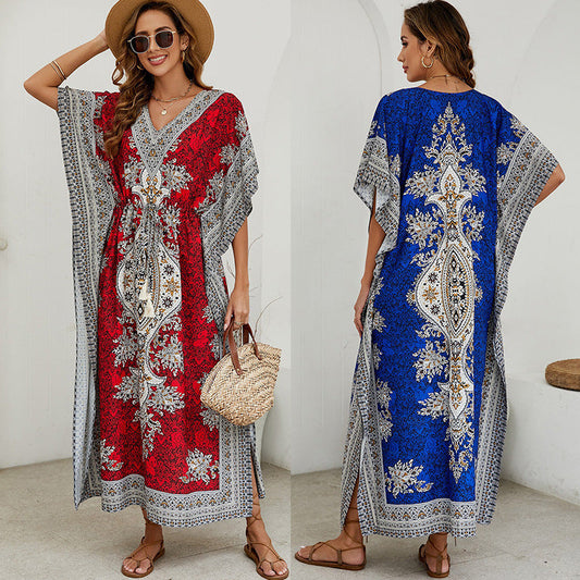 Women's long dress – Breathable fabric – Flowing cut – Short wide sleeves – V-neck