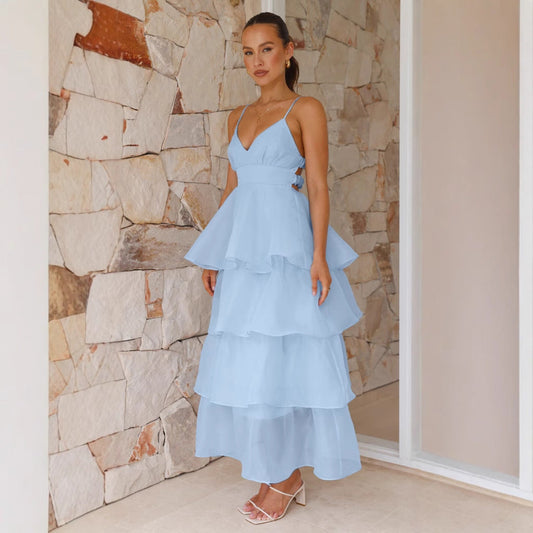 Women's long dress – Light breathable fabric – Thin straps – V-neck – Layered ruffles