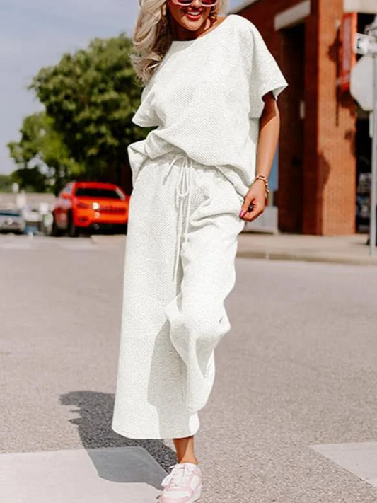 Casual Women's Set – Soft Knit – Loose Short Sleeve Top – Wide Pants