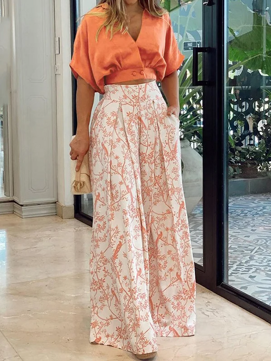 Women's Two-Piece Set – Cropped Top Batwing Sleeves – Loose High-Waisted Pants – Breathable Fabric