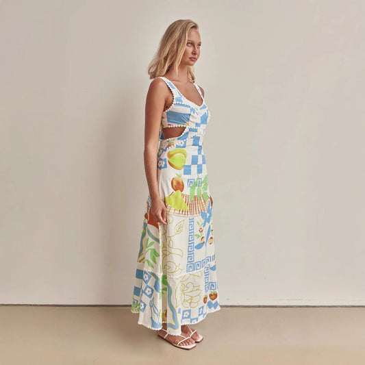 Long women's dress – Thin straps – V-neckline – Cut-out waist – Fluid print