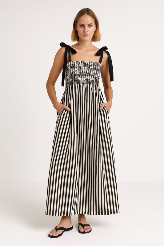 Women's dress with thin straps – Breathable fabric – Ruched bodice – Long flared skirt – Built-in pockets