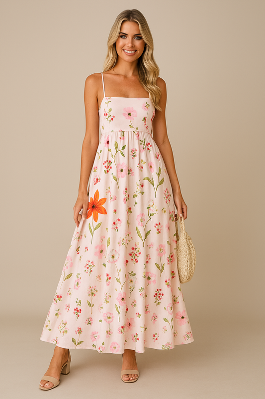 Long women's dress – Backless – Flared cut – Breathable fabric – Floral print