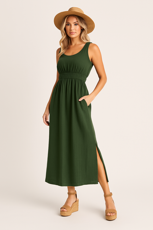 Women's sleeveless dress – Flared cut – Breathable fabric – Midi length – Practical pockets