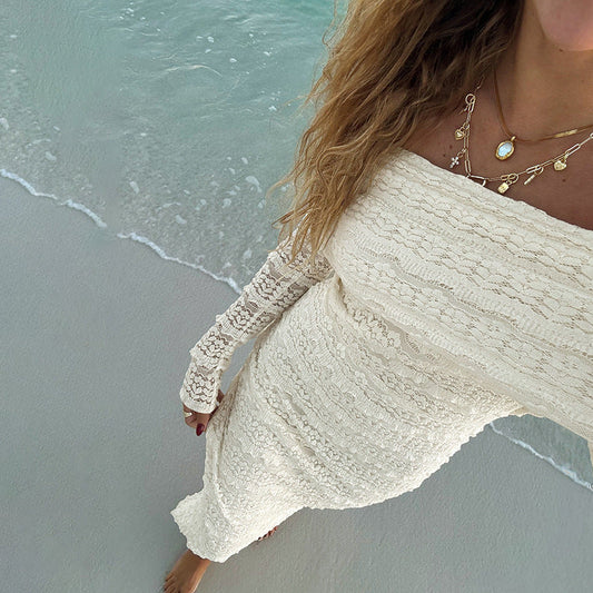 Women's long dress – Elegant lace – Fitted cut – Bare shoulders long sleeves