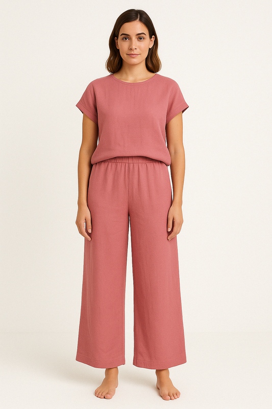 Two-piece set for women - Loose fit - Short-sleeved round-neck top - Wide-leg elastic-waist pants
