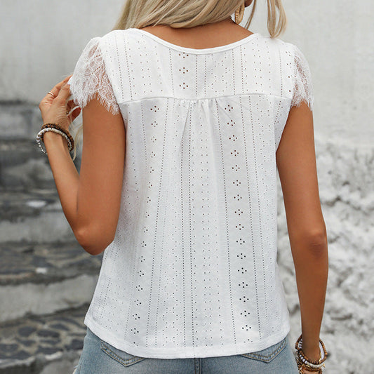 Women's V-neck top – relaxed fit – lace – eyelet embroidery – short sleeves
