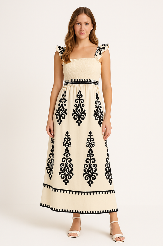 Women's long dress – Loose fit – Cotton – Bohemian print – Ruffled straps