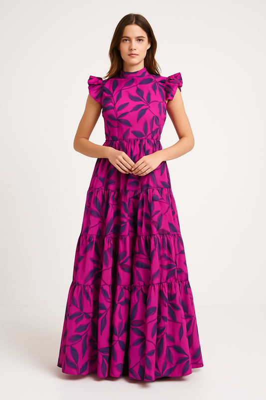 Long women's dress – Elegant flared cut – Ruffled sleeves – Tiered skirt – Bold print