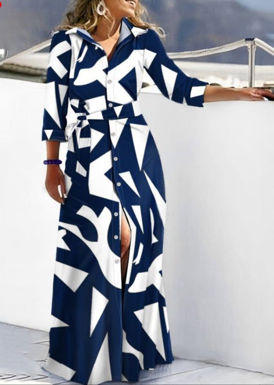 Women's dress – Fitted waist – Stand-up collar – Long sleeves – Printed asymmetrical hem
