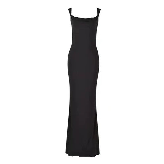 Women's evening dress – Fitted cut – Draped neckline – Satin maxi length