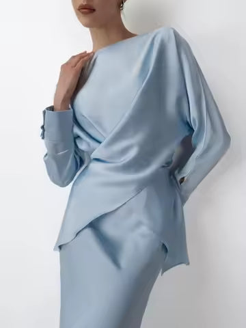Women's set straight midi skirt – draped long-sleeved top – satin finish