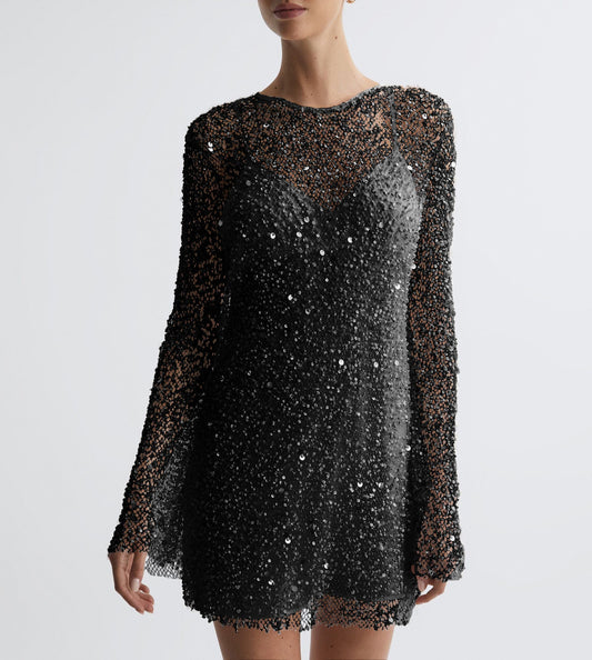 Women's cocktail dress – Fitted cut – Long sleeves – Sequins – Mini length