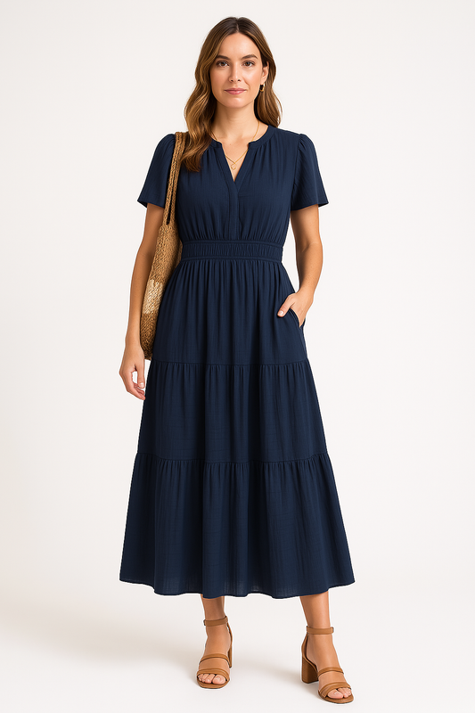 Women's long dress – V-neck – Puff sleeves – Ruched waist – Flared cut