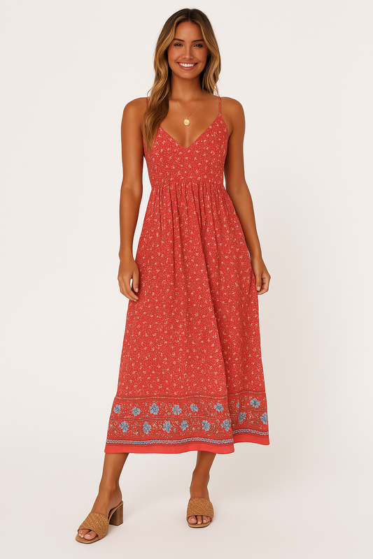 Women's long dress – Fluid fit – V-neck – Thin straps – Bohemian print