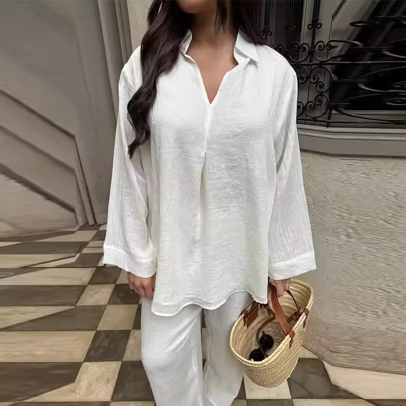 Ensemble Deux Pièces Femme – Blouse Col Revers – Pantalon Large – Lin Coton Doux
