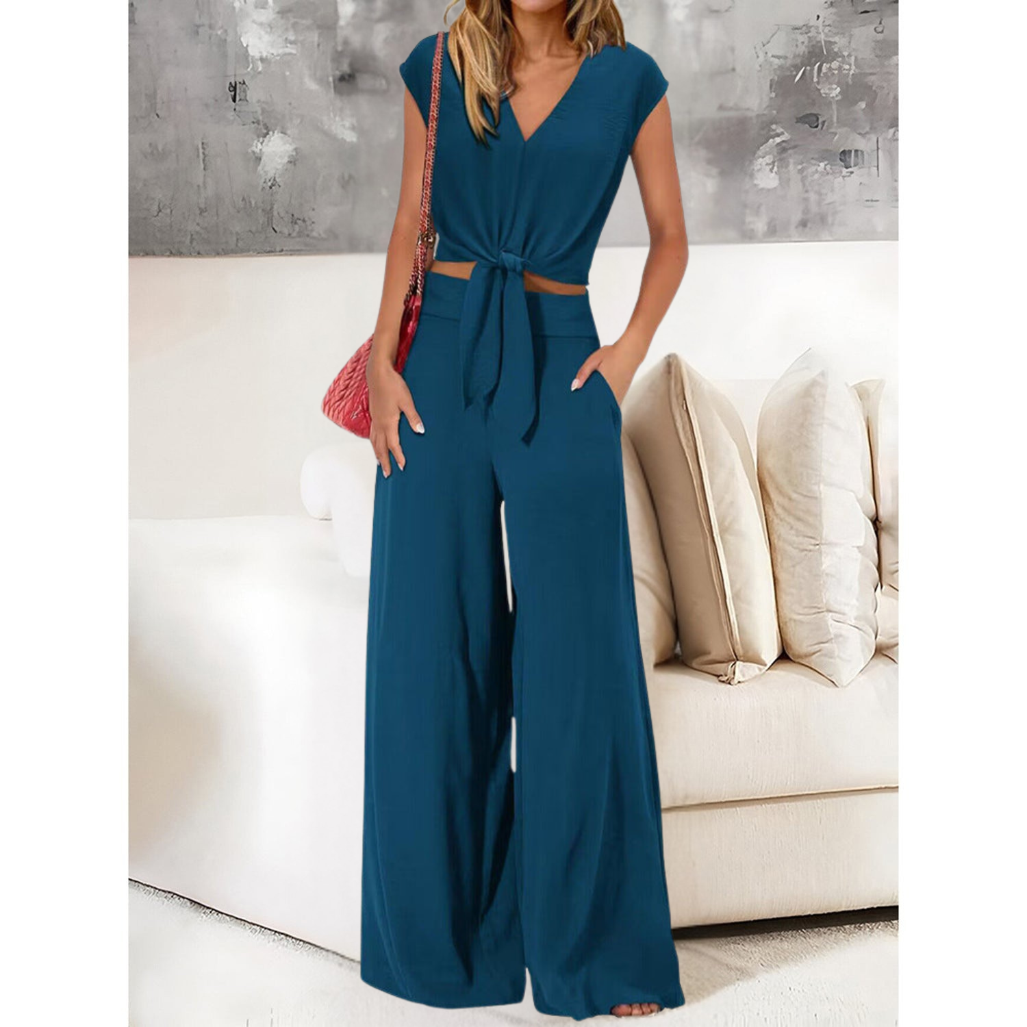 Women's 2-piece set – Cropped tie-front V-neck top – High-waisted wide-leg pants