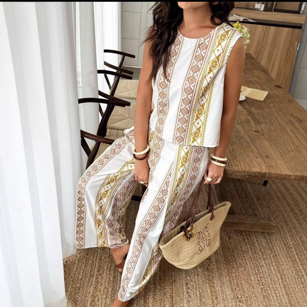 - Design: Ensemble débardeur et pantalon large avec motif géométrique