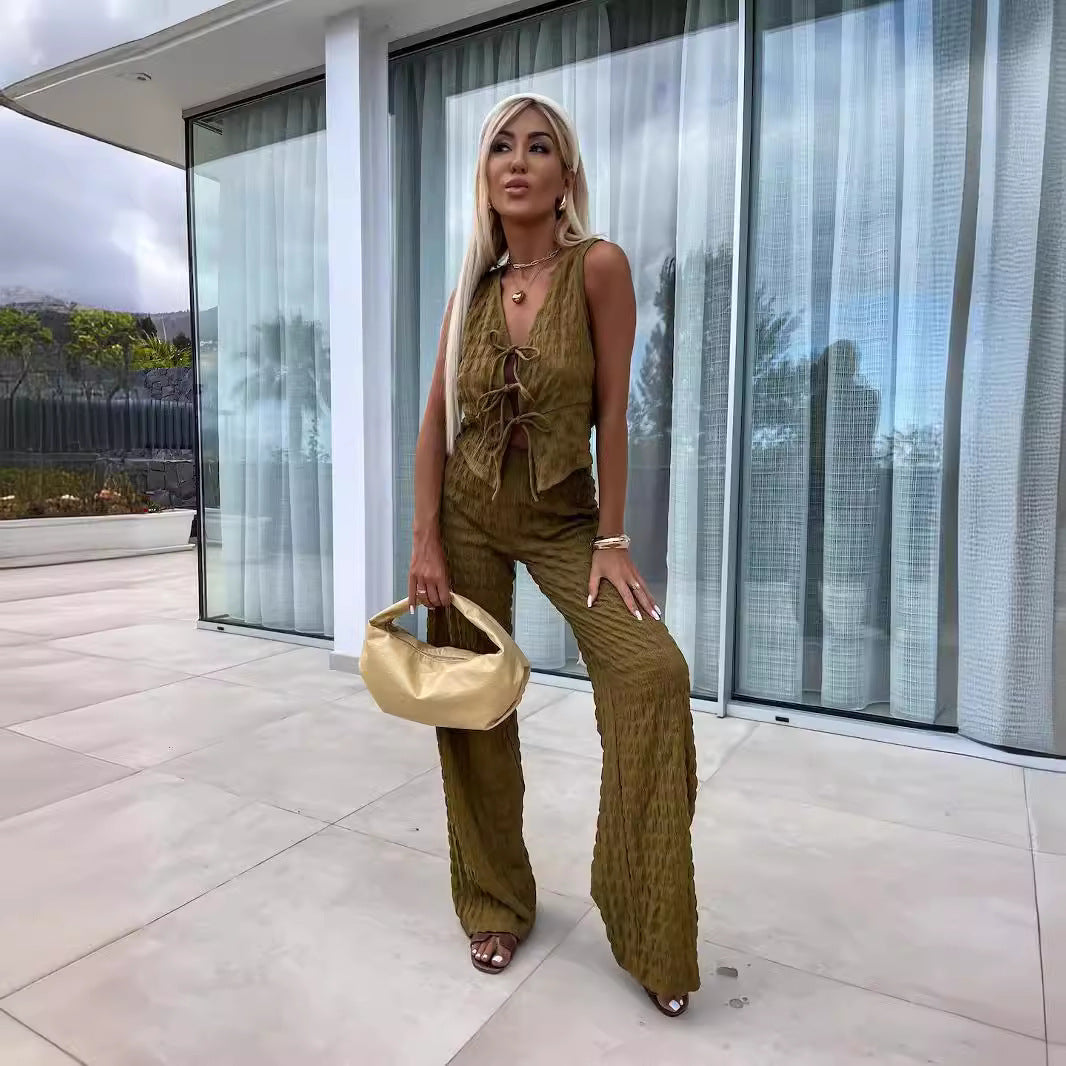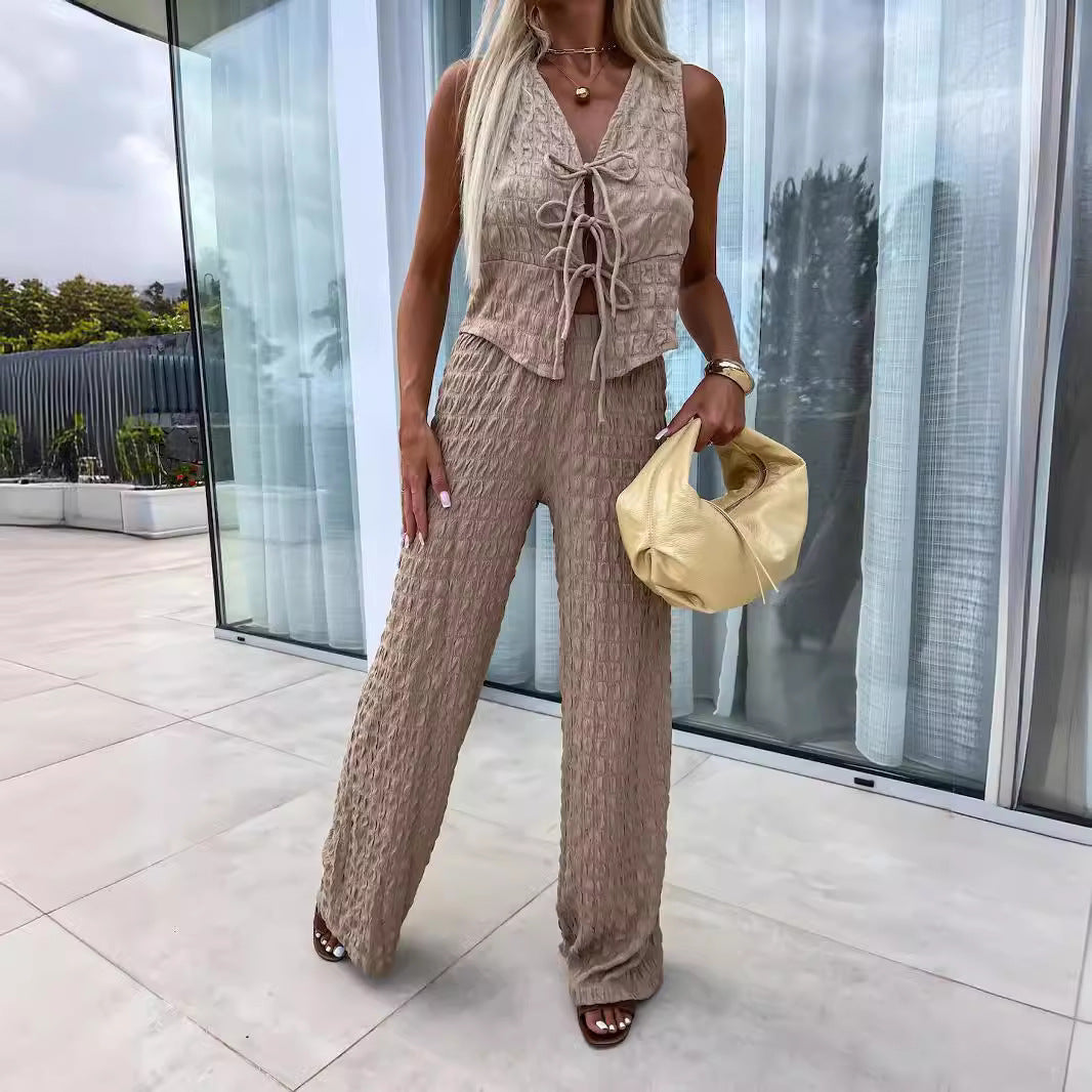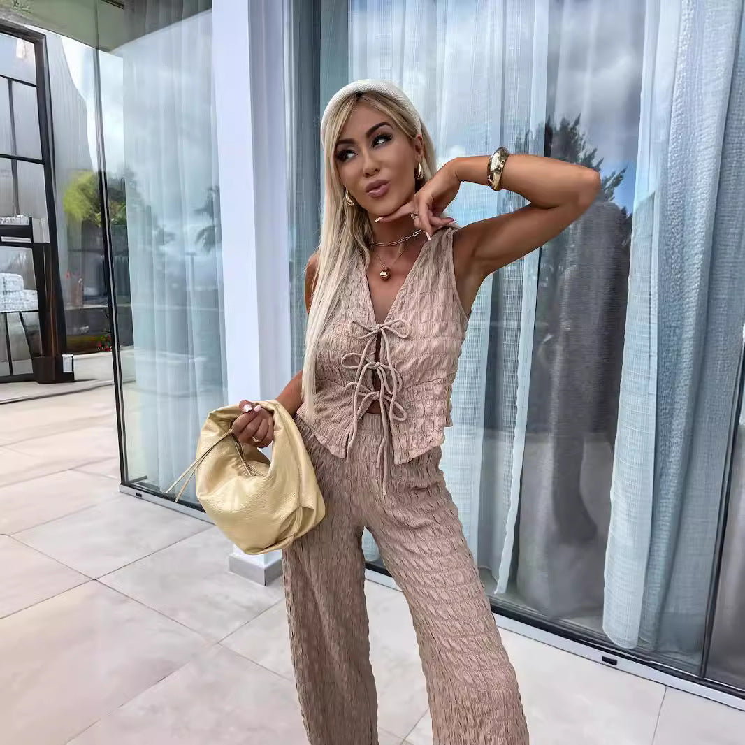 Women's Set Sleeveless Top and Pants – Tied V-Neck – Crinkled Fabric Straight Cut